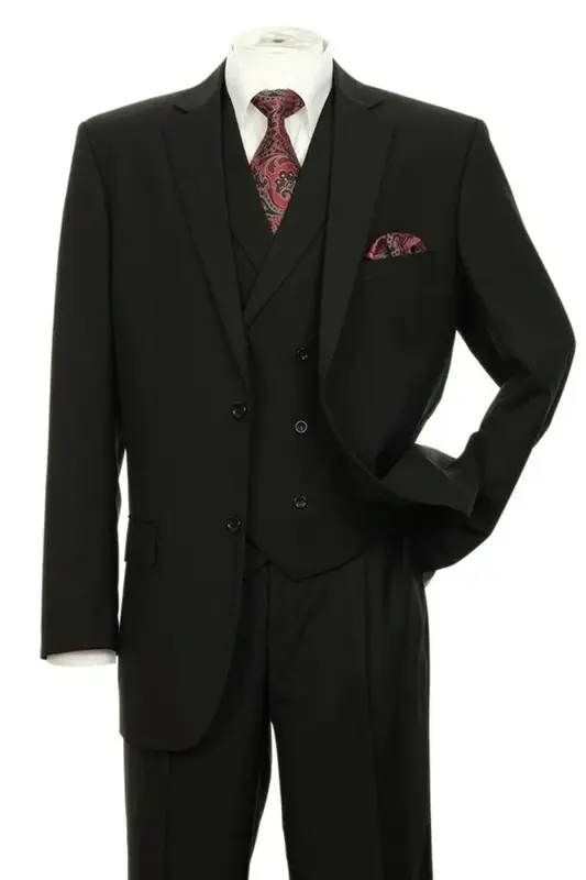 Modern classic style: This suit features a 2 button classic fit jacket with notch lapel and side vents, a matching double breasted vest, and matching pleated pants for timeless style.. Comfortable fit: The jacket's classic fit and side vents provide an optimal fit and maximum comfort.. Versatility: The double breasted vest and pleated pants add a touch of sophistication, making this suit perfect for both formal and casual occasions.. This modern classic suit is the perfect combination of style, comfort, and versatility. Featuring a 2 button classic fit jacket with notch lapel and side vents, a matching double breasted vest, and matching pleated pants, this suit will keep you looking sharp and feeling comfortable for any occasion.