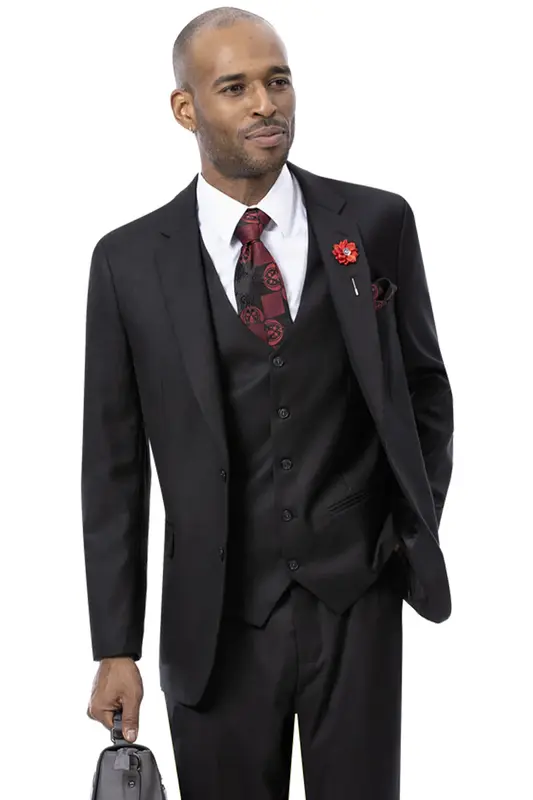 "Black Sharkskin Business Suit - Men's Modern Fit Two-Button Vested"