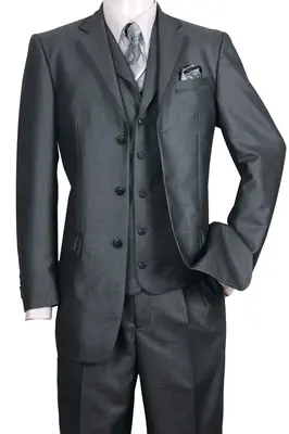 Stylish: Beautiful textured weave pattern sharkskin material with satin trim along the lapel and pockets.. Comfortable: 3 button closure and matching pleated pants for a comfortable fit.. Versatile: Perfect for a variety of occasions, from a day at the office to a Sunday at church.. This 3 Button mens suit is the perfect combination of style, comfort, and versatility. Crafted from a beautiful textured weave pattern sharkskin material, it features a 3 button closure, a matching lapelled vest, and matching pleated pants with satin trim along the lapel and pockets. Whether you're looking for a suit to wear to the office or a Sunday at church, this suit is the perfect choice.