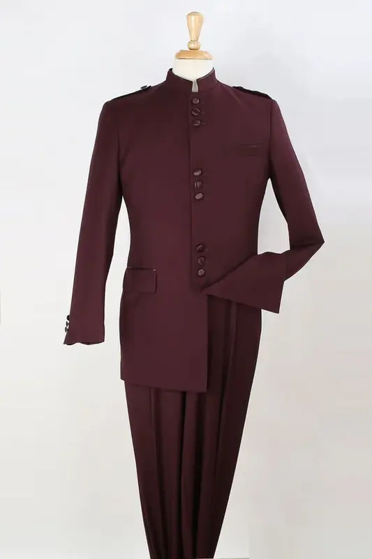 "Burgundy Men's Classic Military Mandarin Safari Suit - Banded Collar"