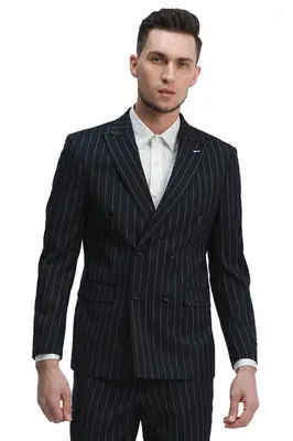Style: Double-breasted peak lapel jacket with two-button closure and pinstripe pattern, plus matching slim-fit pinstripe pants.. Comfort: Side flap pockets and chest pocket on the jacket provide plenty of storage, while the slim-fit pants ensure a comfortable fit.. Versatility: This classic combination can be dressed up for formal occasions or dressed down for a night out on the town.. This two-piece men's suit is the perfect combination of style, comfort, and versatility. The double-breasted peak lapel jacket with two-button closure and pinstripe pattern is both timeless and modern. The side flap pockets and chest pocket provide plenty of storage, while the slim-fit pants ensure a comfortable fit. Whether you're attending a formal event or a night out on the town, this classic combination is sure to make a statement.