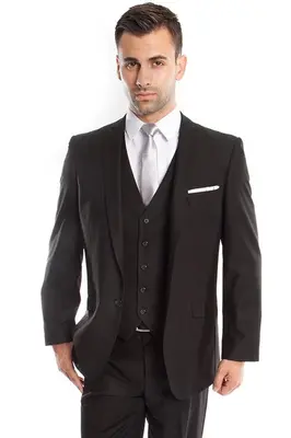 Jacket: Slim fit, two-button front closure, slim notch lapel, side vents, interior French facing, two besom front pockets with flap closure, three interior pockets, and underarm sweat guards for comfort.. Vest: Five-button closure for a sleek look.. Pants: Flat-front, two back besom pockets with button closure, two front angled slip pockets, lined to the knee, 37-inch inseam, zip fly, and extended button closure on waistband.. This three-piece suit set is the perfect combination of style, comfort, and versatility. The slim fit jacket features a two-button front closure, slim notch lapel, side vents, interior French facing, two besom front pockets with flap closure, three interior pockets, and underarm sweat guards for comfort. The five-button closure vest provides a sleek look, while the flat-front pants are lined to the knee with two back besom pockets with button closure, two front angled slip pockets,