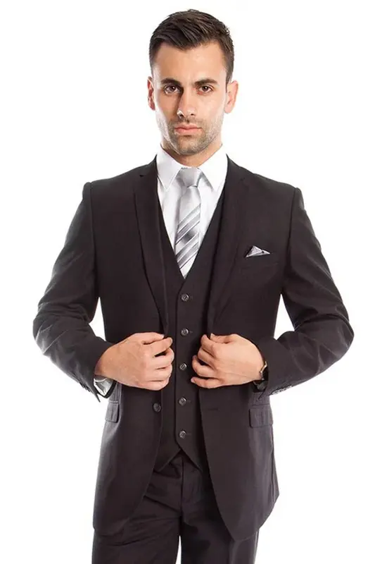 Jacket: Slim fit, two-button front closure, slim notch lapel, side vents, interior French facing, two besom front pockets with flap closure, three interior pockets, and underarm sweat guards for comfort.. Vest: Five-button closure for a sleek look.. Pants: Flat-front, two back besom pockets with button closure, two front angled slip pockets, lined to the knee, 37-inch inseam, zip fly, and extended button closure on waistband.. This three-piece suit set is the perfect combination of style, comfort, and versatility. The slim fit jacket features a two-button front closure, slim notch lapel, side vents, interior French facing, two besom front pockets with flap closure, three interior pockets, and underarm sweat guards for comfort. The five-button closure vest provides a sleek look, while the flat-front pants are lined to the knee with two back besom pockets with button closure, two front angled slip pockets,
