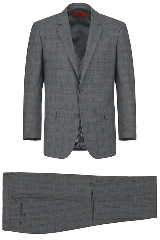 "Charcoal Grey Windowpane Plaid Men's Classic Fit Vested Suit - Two Button"