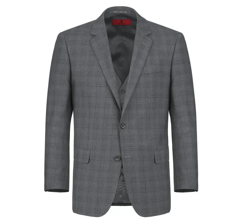 "Charcoal Grey Windowpane Plaid Men's Classic Fit Vested Suit - Two Button"