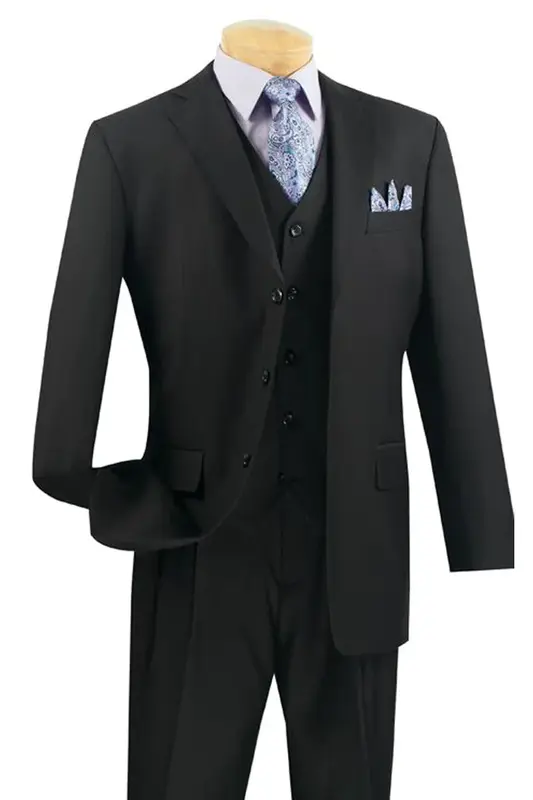 "Classic Fit Men's 3-Button Vested Basic Black Suit"