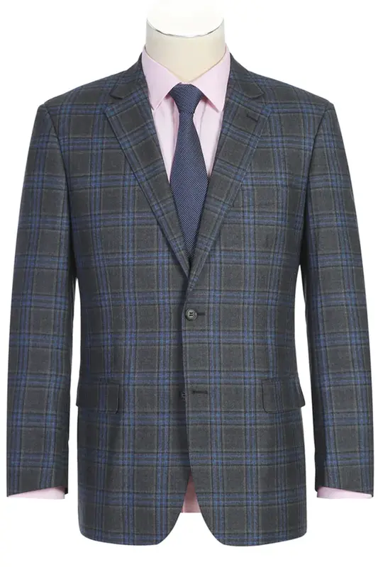 "Classic Fit Men's Wool Suit - Two Button Vested in Grey & Blue Windowpane Plaid"