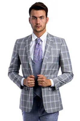 Jacket:. Stylish windowpane pattern. One button front closure and peak lapel for a polished look. Hybrid fit for comfort and versatility. Interior french facing and three interior pockets. Two besom front pockets with flap closure. Underarm sweat guards for breathability. Vest:. Solid double breasted design. U-neck and four button closure. Two pockets. Pants:. Solid flat front design. Two back besom pockets with button closure. Two front angled slip
