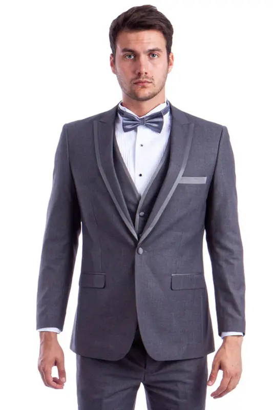 "Grey Men's Wedding Tuxedo - One Button Peak with Satin Trim"