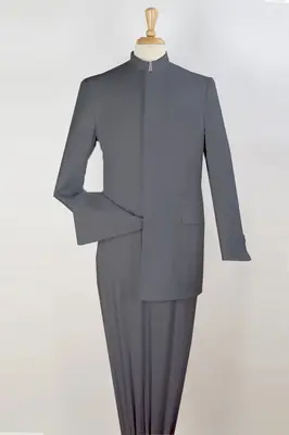 Stylish - French front mandarin / banded collar for a modern, sophisticated look.. Comfortable - Square button and matching pleated pants for a relaxed, tailored fit.. Versatile - Wear this suit for a variety of occasions, from the office to a night out.. This men's suit is the perfect combination of style, comfort, and versatility. The french front mandarin / banded collar and square button create a modern, sophisticated look, while the matching pleated pants provide a relaxed, tailored fit. This suit is perfect for any occasion, from the office to a night out.