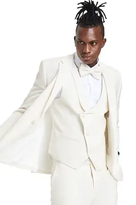 Jacket: Notch lapel, side flap pockets, and a slit chest pocket give this polka-dot jacket a classic and stylish look.. Pants: Skinny fit and flat front make these polka-dot pants a comfortable yet fashionable choice.. Vest: Three-button, double-breasted, and polka-dot make this vest a versatile addition to any wardrobe.. This three-piece set is perfect for any occasion. The timeless polka-dot pattern and classic style of the jacket, pants, and vest make for a sophisticated and stylish look. The jacket features a notch lapel, side flap pockets, and a slit chest pocket for a classic look. The pants have a skinny fit and flat front for comfort and style. The vest is three-button, double-breasted, and polka-dot for a versatile addition to any wardrobe. Whether you're attending a formal event or just need a stylish update, this three-piece set is a perfect choice.
