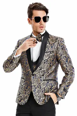 Jacket:. Gold Paisley pattern for a unique, stylish look. Solid Shawl Collar for added comfort and style. Skinny Fit for a modern, streamlined silhouette. One Button Front Closure for a secure, adjustable fit. Two Side Slit Pockets for convenient storage. Vest:. Gold Paisley pattern for a unique, stylish look. Solid Textured fabric for a luxurious feel. Double Breasted for an elegant, timeless look. Three Button Closure for a secure, adjustable fit. Pants: