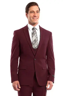 Jacket:. Solid construction and ultra slim fit for a modern, polished look. One button front closure with peak lapel and interior French facing. Two besom front pockets with flap closure and three interior pockets for ample storage. Underarm sweat guards for added comfort. Vest:. U-shape design and four buttons for a classic, tailored look. Pants:. Flat front and two back besom pockets with button closure for a sleek silhouette. Two front angled slip pockets for convenient storage