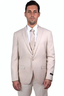 "Men's Skinny Wedding Suit - One Button Peak Lapel with Lowcut Vest, Tan"