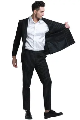 Style: Double-breasted peak lapel jacket with two-button closure and pinstripe pattern, plus matching slim-fit pinstripe pants.. Comfort: Side flap pockets and chest pocket on the jacket provide plenty of storage, while the slim-fit pants ensure a comfortable fit.. Versatility: This classic combination can be dressed up for formal occasions or dressed down for a night out on the town.. This two-piece men's suit is the perfect combination of style, comfort, and versatility. The double-breasted peak lapel jacket with two-button closure and pinstripe pattern is both timeless and modern. The side flap pockets and chest pocket provide plenty of storage, while the slim-fit pants ensure a comfortable fit. Whether you're attending a formal event or a night out on the town, this classic combination is sure to make a statement.
