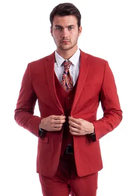Jacket:. Stylish two-button closure. Slim fit and notch lapel for a modern look. Side vents for breathability and comfort. Interior French facing and three interior pockets for convenience. Two besom front pockets with flap closure. Underarm sweat guards for extra protection. Vest:. Four-button closure and V-neck for a classic look. Pants:. Flat-front design for a timeless silhouette. Two back besom pockets with button closure. Two front angled slip pockets for convenience. Lined to the knee and 37-inch inseam for comfort. Zip fly and extended button closure on waistband. This men's three-