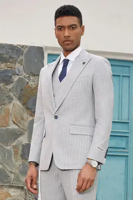 Jacket:. Pinstripe design for a timeless, classic look. Single Breasted with a peak lapel and one button closure for a tailored fit. Hybrid Fit for a comfortable, versatile style. Side Flap Pockets for a polished finish. Vest:. Pinstripe Matching Vest to complete the look. Double Breasted with four buttons for a sleek fit. Hybrid Fit for comfortable, stylish wear. Side Slit Pockets for easy access. Pants: