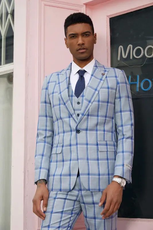 Jacket: Plaid single-breasted one-button closure with peak lapel and side flap pockets. Pants: Hybrid fit plaid flat front. Vest: Four-button plaid with side pockets. This men's plaid suit is the perfect combination of style, comfort, and versatility. The jacket features a single-breasted one-button closure with peak lapel and side flap pockets for a classic, timeless look. The hybrid fit plaid flat front pants provide a comfortable fit while the four-button plaid vest with side pockets adds a touch of sophistication. This suit is perfect for any occasion, whether it's a business meeting, a special event, or a night out.