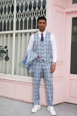 Jacket: Plaid single-breasted one-button closure with peak lapel and side flap pockets. Pants: Hybrid fit plaid flat front. Vest: Four-button plaid with side pockets. This men's plaid suit is the perfect combination of style, comfort, and versatility. The jacket features a single-breasted one-button closure with peak lapel and side flap pockets for a classic, timeless look. The hybrid fit plaid flat front pants provide a comfortable fit while the four-button plaid vest with side pockets adds a touch of sophistication. This suit is perfect for any occasion, whether it's a business meeting, a special event, or a night out.