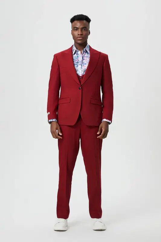 "Mens Stacy Adams Suit - Stacy Adams Suit Men's Designer Suit - Cherry Red, One Button Peak Lapel with Vest"