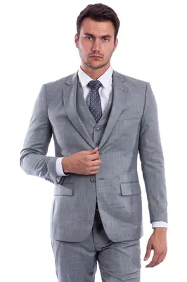 Jacket: Sharkskin single breasted two button closure with a notch lapel and two flap pockets.. Vest: Sharkskin five button closure with a V-neck.. Pants: Hybrid fit flat front with two back besom pockets and two angled front slip pockets.. This men's three-piece suit is designed to provide the perfect combination of style, comfort, and versatility. The jacket is crafted from sharkskin fabric with a single-breasted two-button closure and a notch lapel. The vest features a sharkskin five-button closure and a V-neck, while the pants are cut for a hybrid fit with a flat front and two back besom pockets and two angled front slip pockets. This timeless ensemble is perfect for any occasion.
