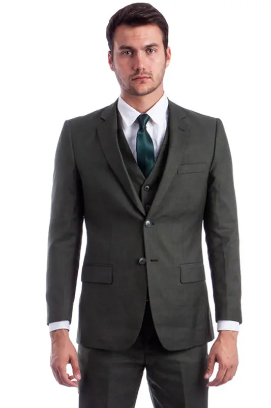 Jacket: Sharkskin single breasted two button closure with a notch lapel and two flap pockets.. Vest: Sharkskin five button closure with a V-neck.. Pants: Hybrid fit flat front with two back besom pockets and two angled front slip pockets.. This men's three-piece suit is designed to provide the perfect combination of style, comfort, and versatility. The jacket is crafted from sharkskin fabric with a single-breasted two-button closure and a notch lapel. The vest features a sharkskin five-button closure and a V-neck, while the pants are cut for a hybrid fit with a flat front and two back besom pockets and two angled front slip pockets. This timeless ensemble is perfect for any occasion.