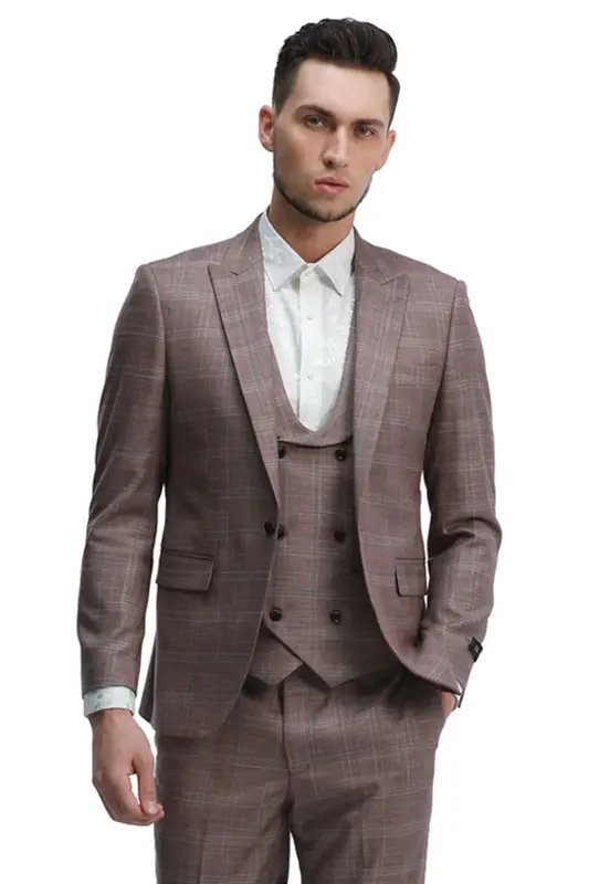 "Rose Pink Plaid Men's Slim Fit Double Breasted Vest Suit"