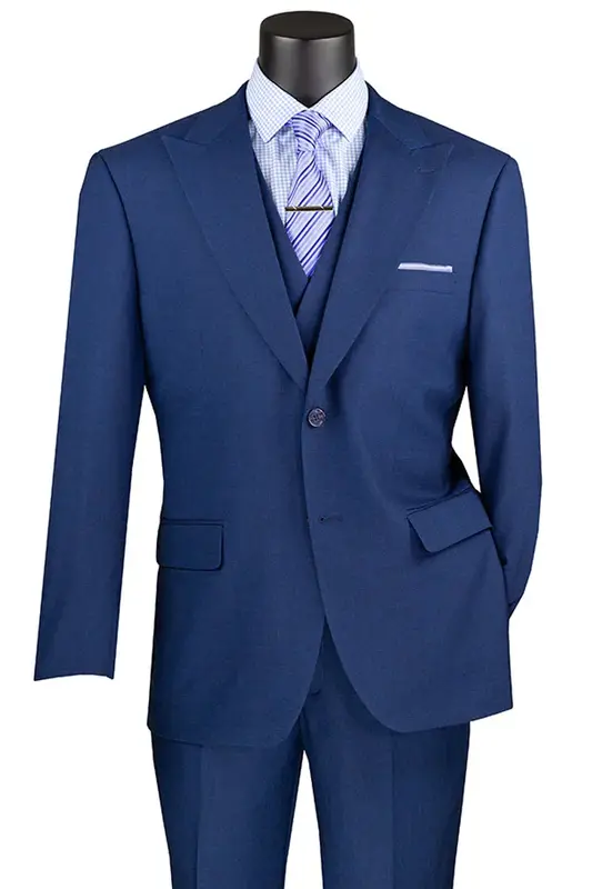 Modern Fit: This suit features an updated, modern fit that is both stylish and comfortable.. Wide Peak Lapel: The wide peak lapel gives this suit a sophisticated and elegant look.. Matching Double Breasted Vest: The matching double breasted vest adds a timeless, classic touch to the suit.. Matching Flat Front Pants: The matching flat front pants provide a sleek and versatile look.. Woven Summer Sharkskin Material: The high-quality woven summer sharkskin material is lightweight and breathable.. This modern fit suit is the perfect combination of style, comfort, and versatility. Featuring a wide peak lapel, matching double breasted vest, and matching flat front pants, this suit is crafted from a lightweight and breathable woven summer sharkskin material. The modern fit ensures that you look and feel your best. Whether you're attending a formal event or a casual gathering, this suit is the perfect choice.