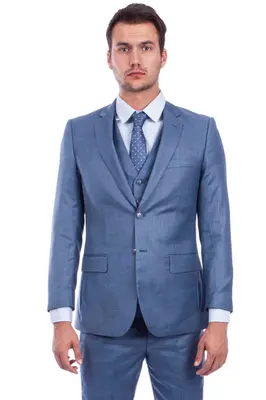 Jacket: Sharkskin single breasted two button closure with a notch lapel and two flap pockets.. Vest: Sharkskin five button closure with a V-neck.. Pants: Hybrid fit flat front with two back besom pockets and two angled front slip pockets.. This men's three-piece suit is designed to provide the perfect combination of style, comfort, and versatility. The jacket is crafted from sharkskin fabric with a single-breasted two-button closure and a notch lapel. The vest features a sharkskin five-button closure and a V-neck, while the pants are cut for a hybrid fit with a flat front and two back besom pockets and two angled front slip pockets. This timeless ensemble is perfect for any occasion.